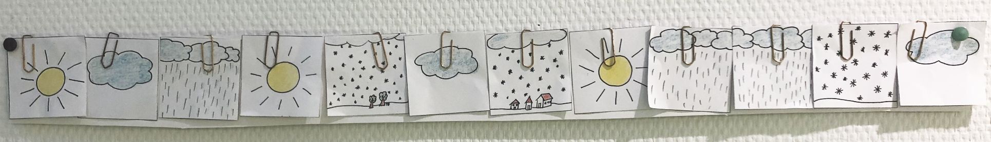 Passend zu dem Thema, das sie in ihrer Gruppe besprechen, male oder fotografiere ich Motive, die in ein Raster mit 12 Bildern kommen. Die Bilder schneide ich aus und hefte sie mit Büroklammern auf einen weißen Pappstreifen.